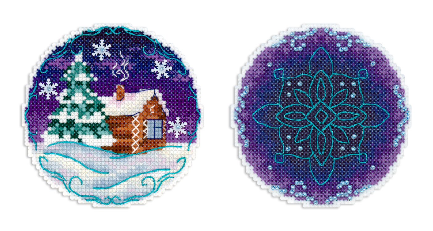 В наборе - белая пластиковая канва 14 каунта, нитки мулине ПНК им.Кирова 16 цв., разобранные на органайзере, бисер - 1 цвет, нитки металлик - 1 цвет, пайетки -1 цвет, игла, бумажная схема и инструкция.