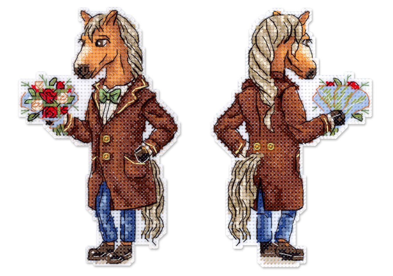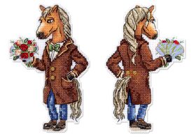 В наборе - белая пластиковая канва 14 каунта, нитки мулине ПНК им.Кирова 21 цв., разобранные на органайзере, пуговица - 1 цвет, игла, бумажная схема и инструкция.